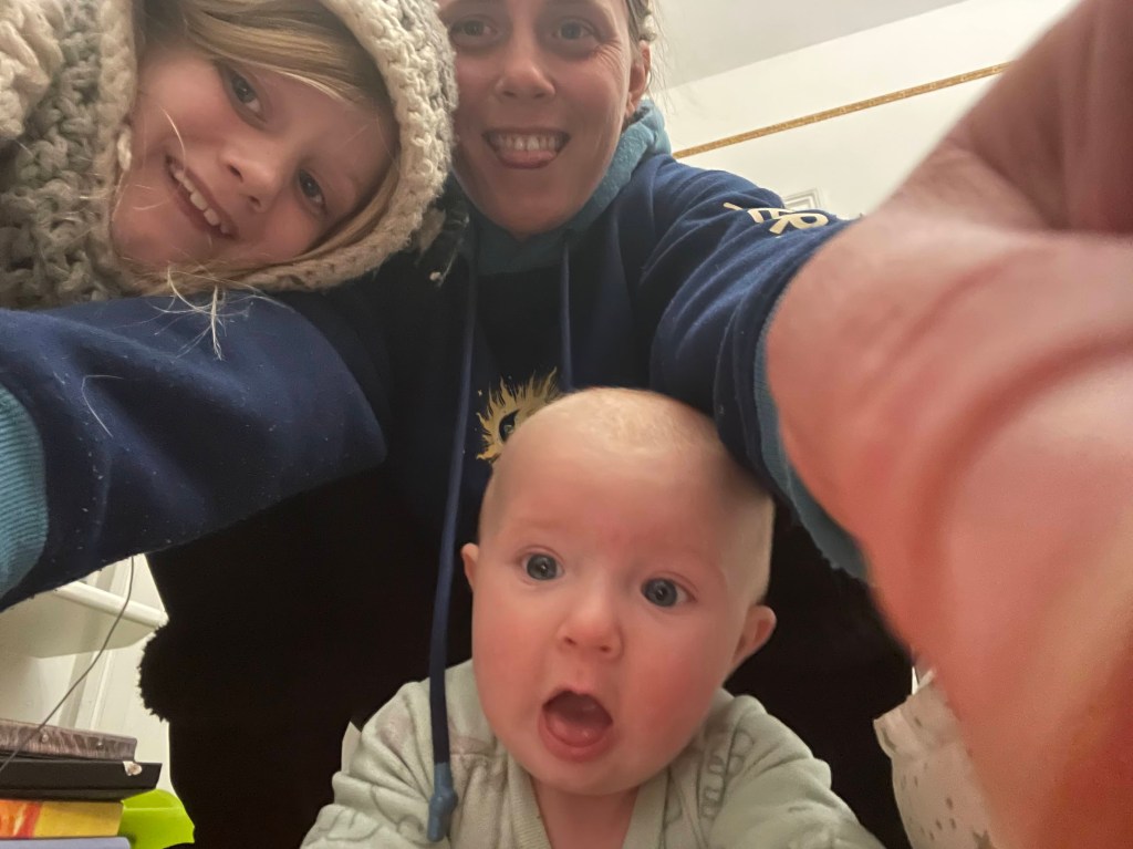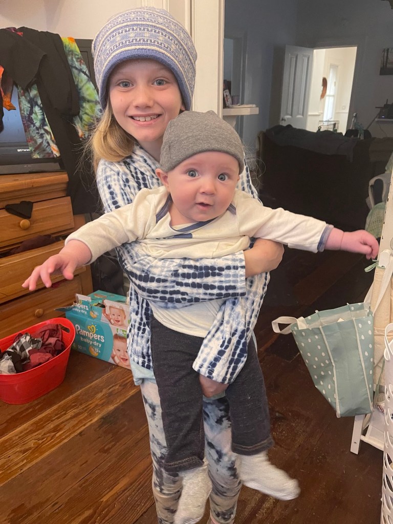 When I work nights or need some extra sleep after being up with the baby for most of the night, my daughter will come into our bed and watch my son as I sleep. She enjoys watching TikTok on my phone while holding the baby. She has helped me sleep countless times.