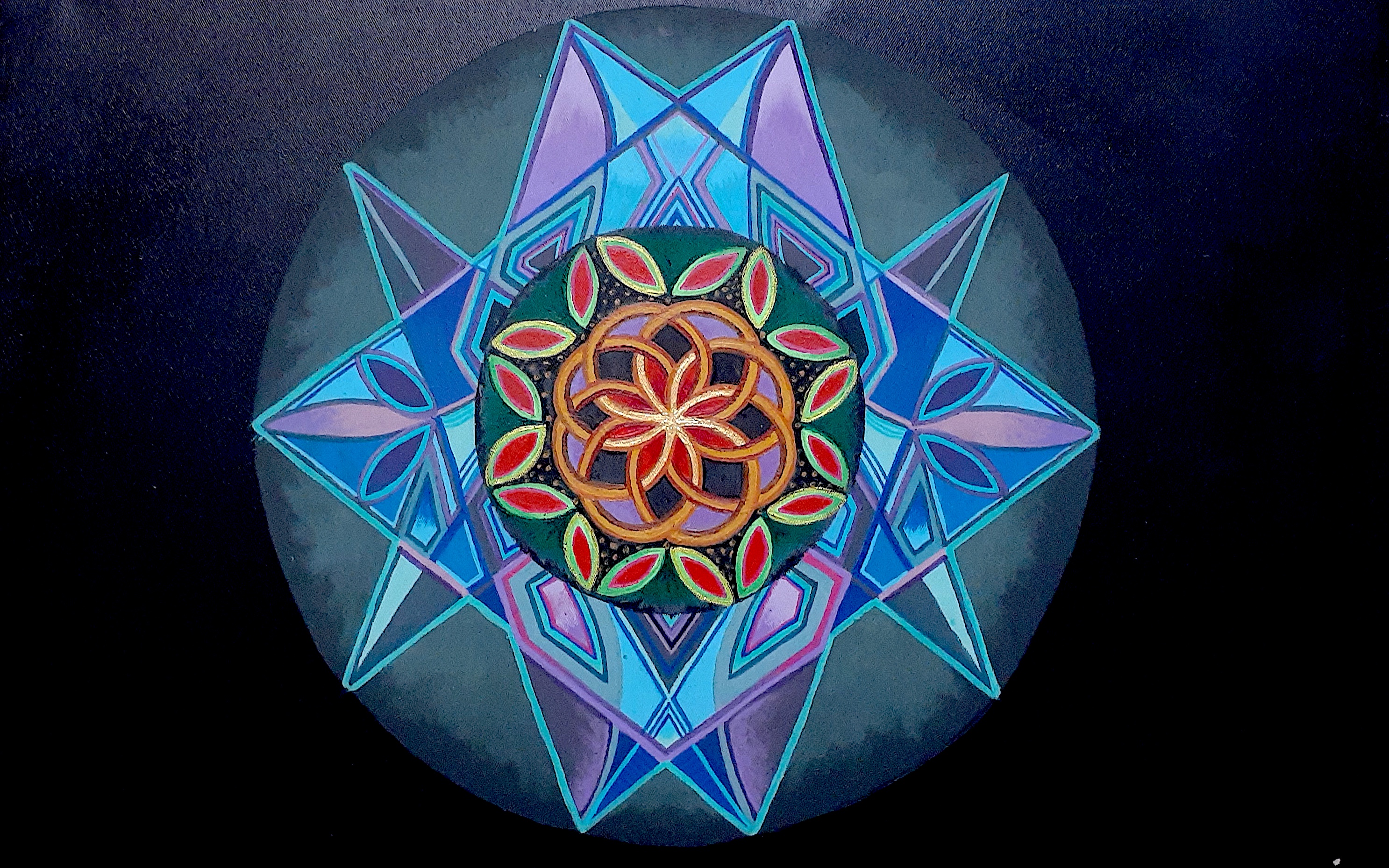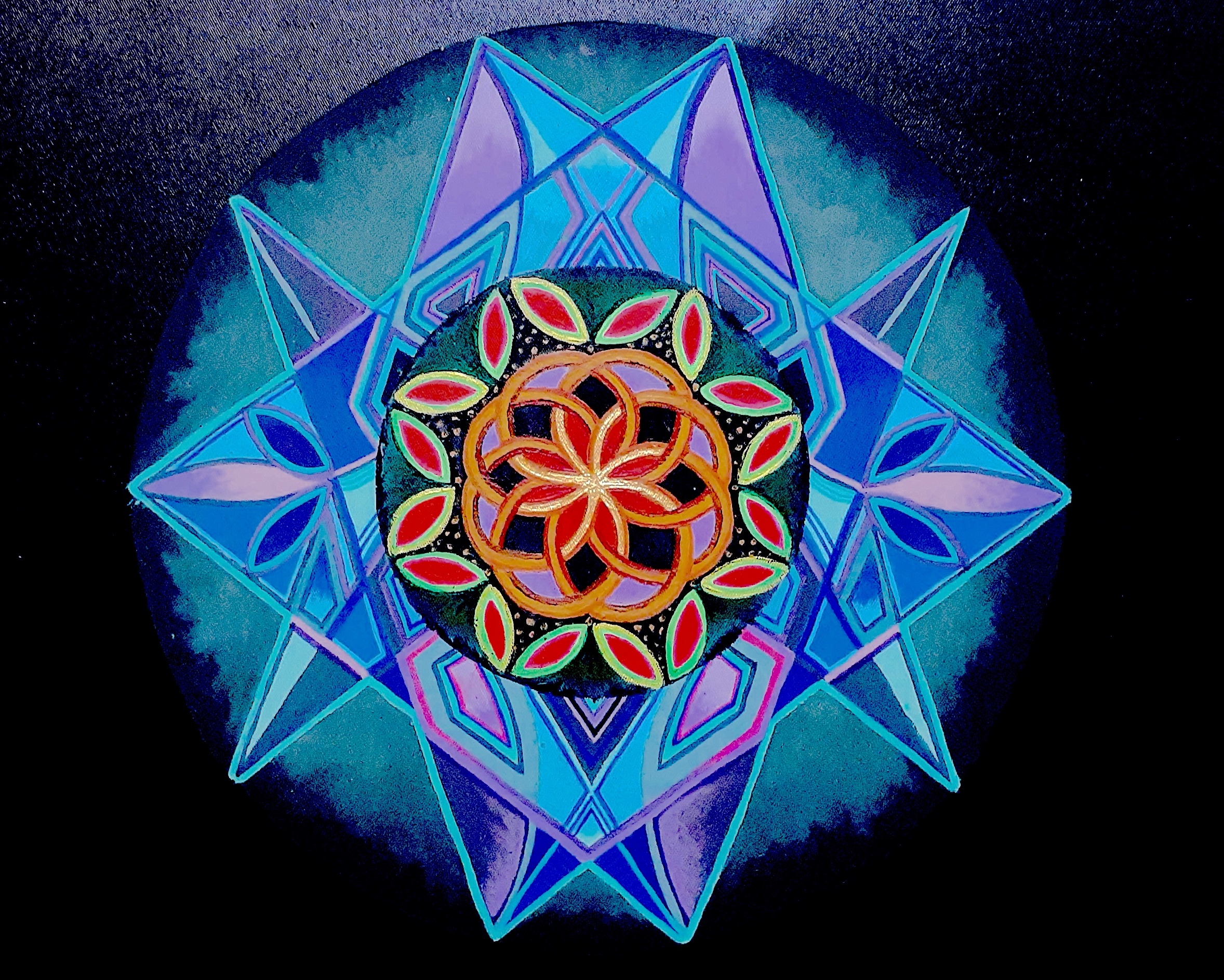 Jeremy Pearson’s “Mandala” stands as his inaugural completed acrylic painting, marking a significant milestone in his artistic journey. Crafted over the course of several years, this mandala emerged through patient dedication, with Jeremy gradually adding layers and details in small increments.