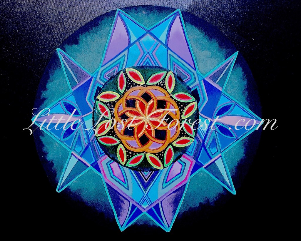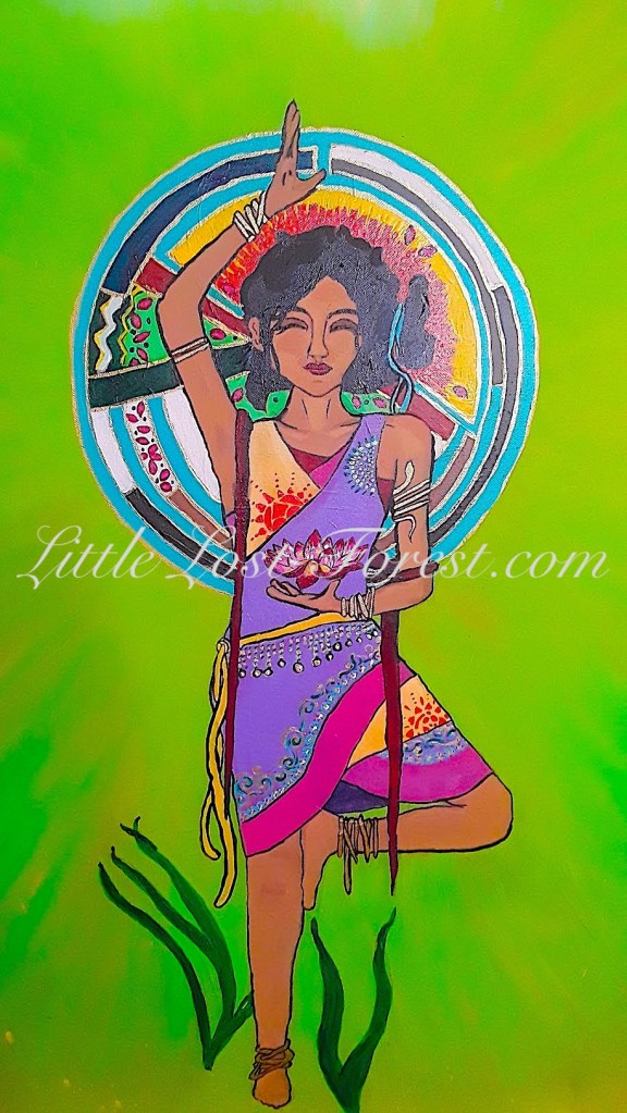 “Yoga Mandala” is a timeless piece, originating around 2016. It began as a gifted canvas with a pre-existing painting that sparked my inspiration for this transformative cover-up. As an avid practitioner of yoga, I am drawn to its profound tranquility, which deeply influences my art. The attire depicted in the mandala draws inspiration from vibrant Indian textiles and loose-fitting jewelry, reflecting the spiritual essence of yoga. My mandala itself is a meditation on the harmonious flow of nature and the boundless concept of the horizon, inviting viewers to contemplate the interconnectedness of existence.