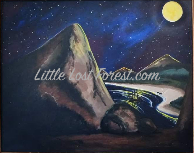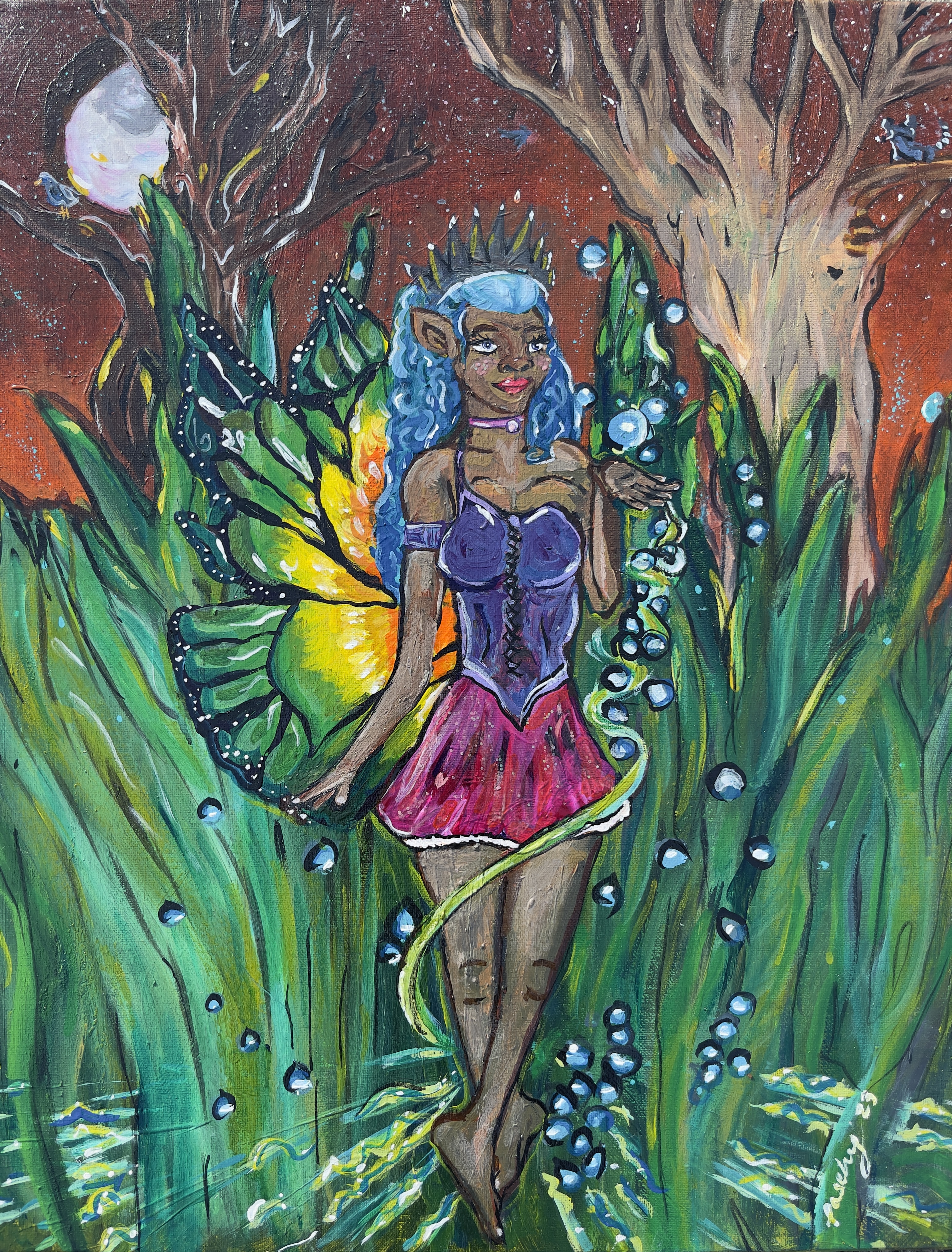 “The Dew Fairy” (2023) is an original acrylic painting by Natascha Pearson, rendered on canvas. In this enchanting backyard scene, the titular character exudes radiant energy, breathing life into the lush, overgrown grass. The moon, nearly full and vibrant, casts its luminous glow behind a majestic tree, setting the nocturnal stage. Birds gracefully soar through the night sky while a curious raccoon perches in the branches of a nearby tree.