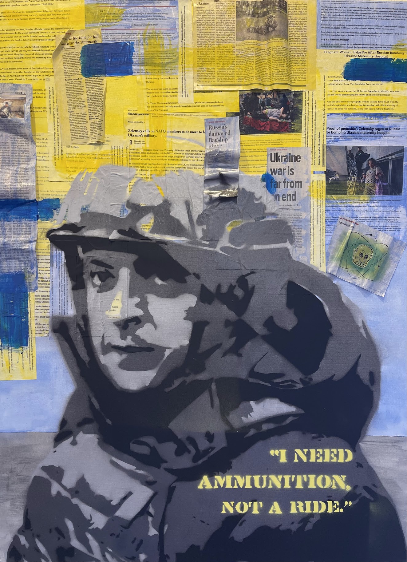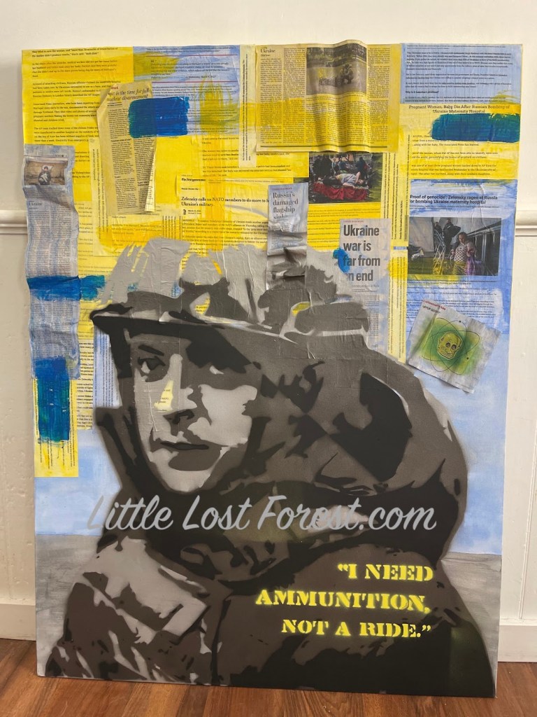 Natascha meticulously crafted stencils of Zelenskyy and the evocative text “I need ammunition, not a ride,” capturing the urgency and resilience of Ukraine’s stance in the face of adversity. These elements are juxtaposed with collaged newspaper fragments adorning the upper portion of the canvas, symbolizing the ongoing narrative of the conflict.