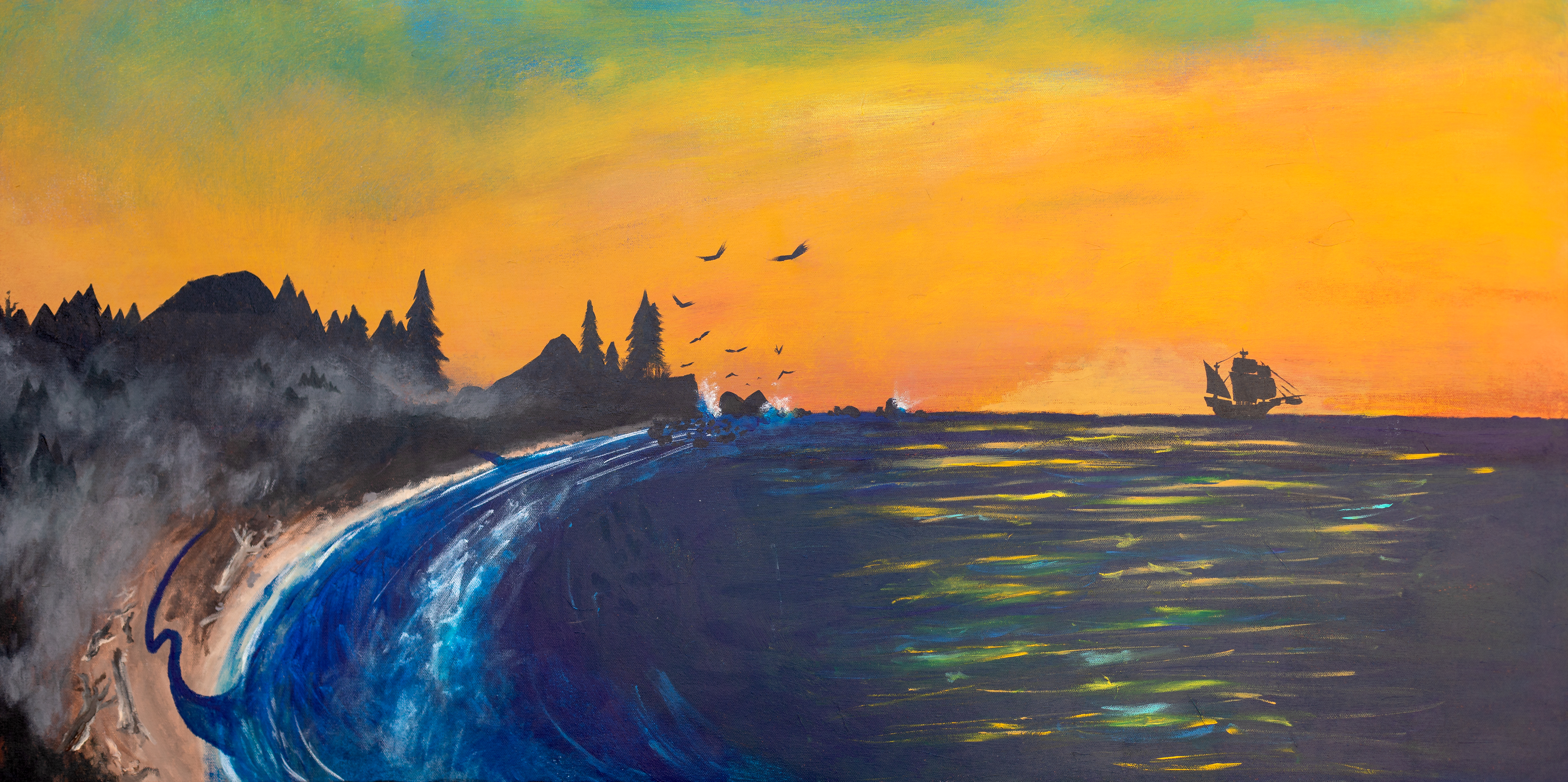 Within the vibrant canvas, dolphins playfully leap around the bow of the boat, a fond memory from Natascha’s sailing excursions to Catalina aboard the Tule More. Known for their bold color palette, Jeremy’s expertise lies in landscape painting, while Natascha meticulously crafts intricate details, including the boat and dolphins, infusing the scene with life and movement.