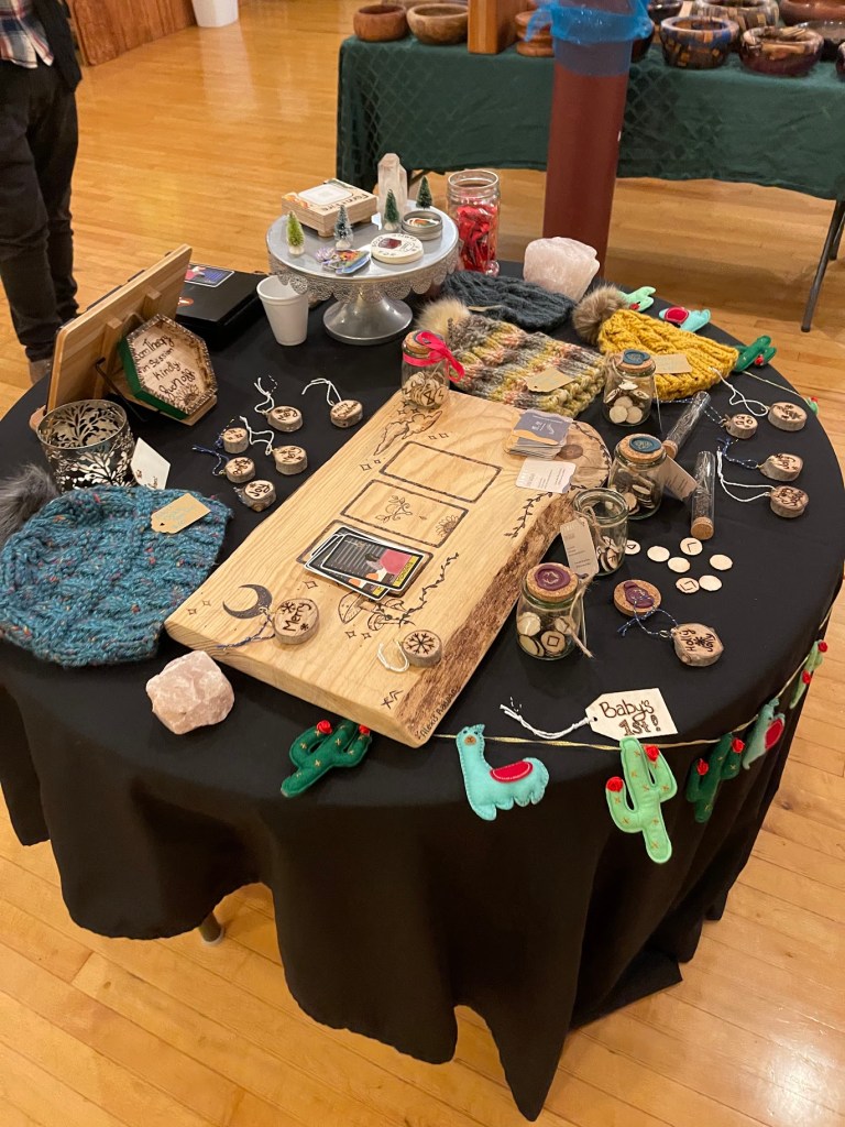Alexis, a Eureka artist, and her partner Novak set up their booth Fern + Fire which can be found on Etsy under FernnFire. They displayed wood-burned wall pieces, runes, Christmas ornaments, and beanies.
