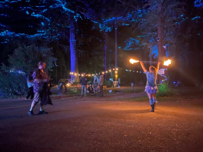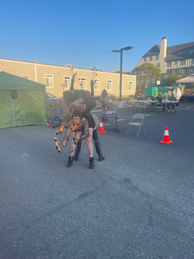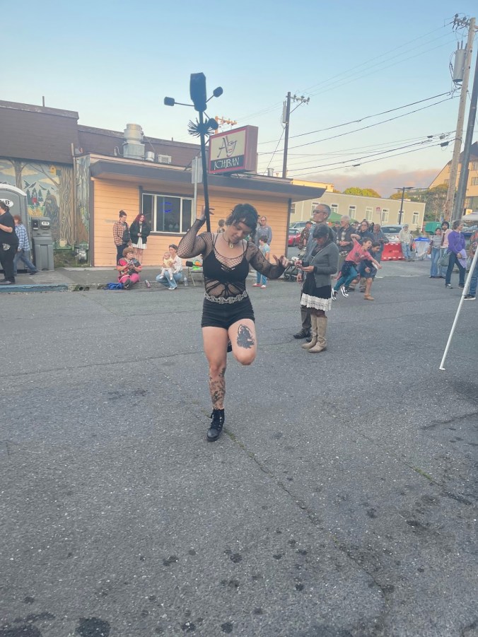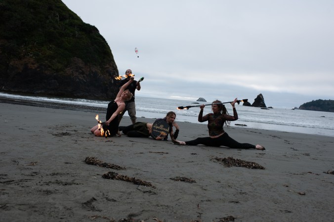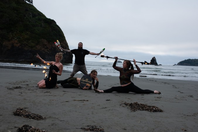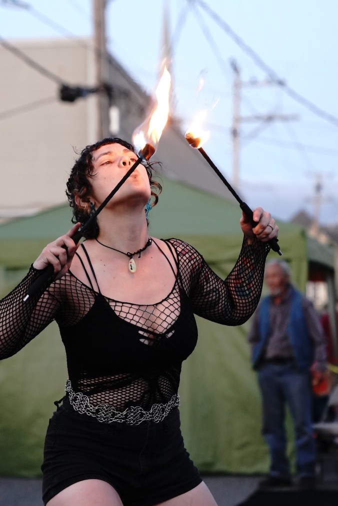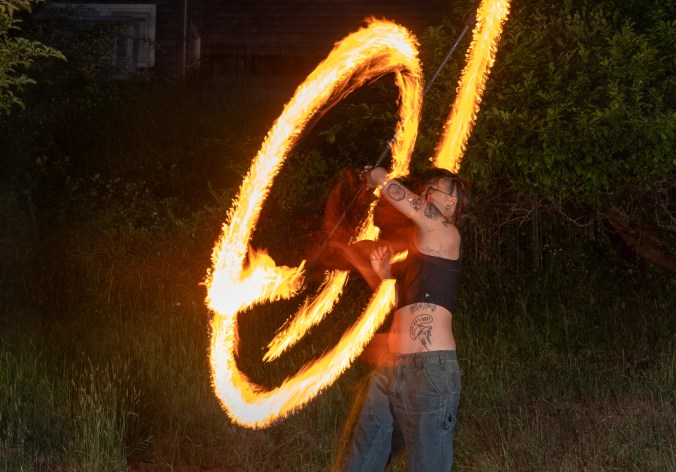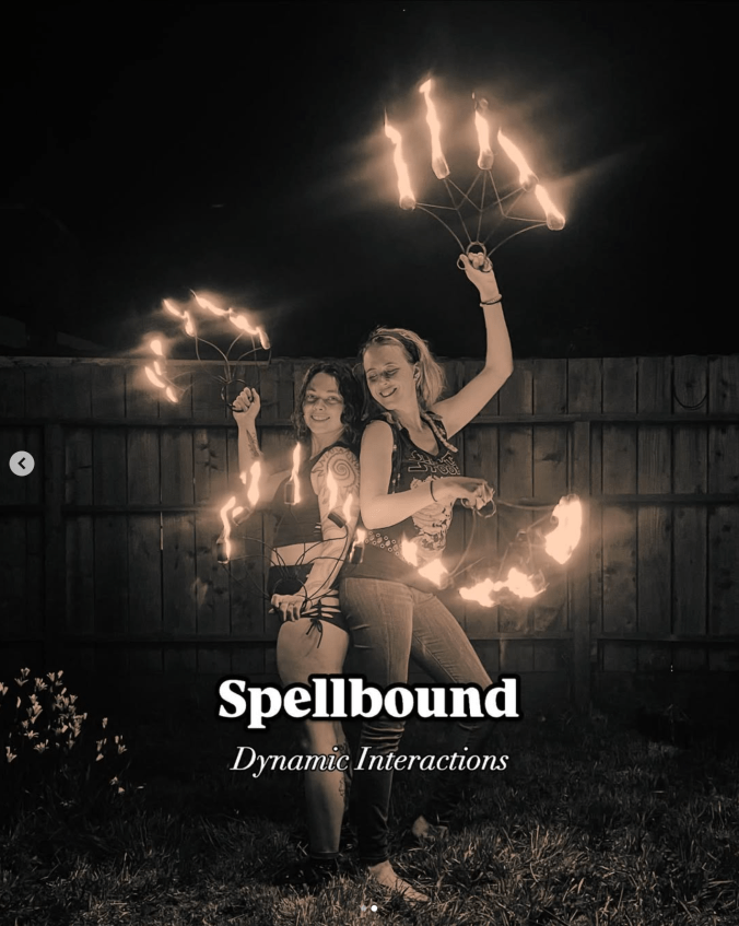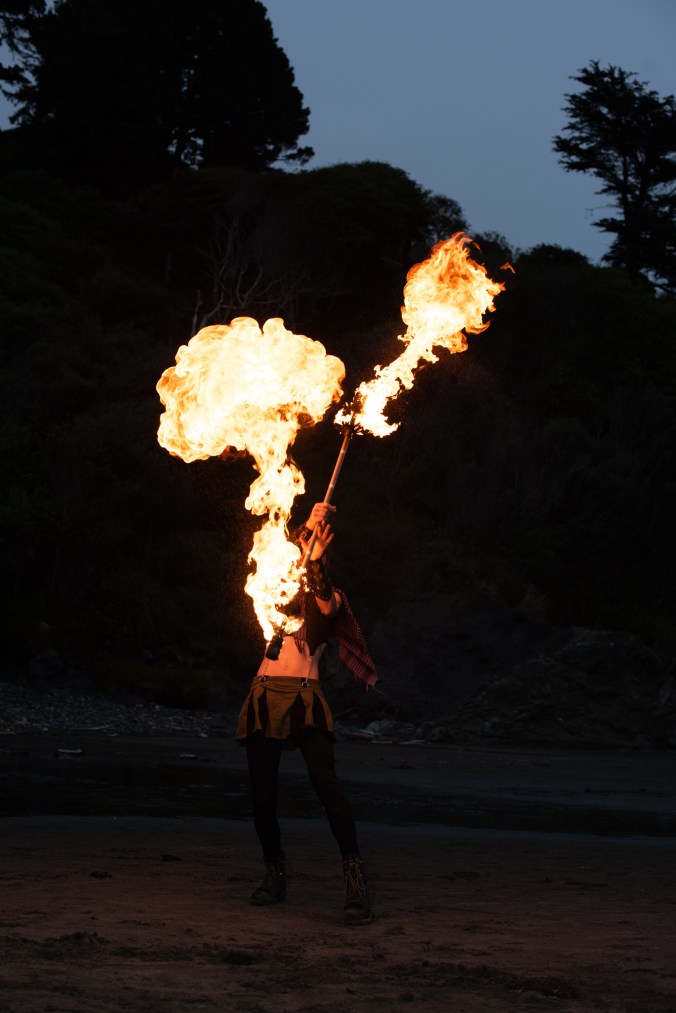Jem is a flow artist who has been fire performing since 2022. Jem performs with dancing, eating, and breathing fire. She fell in love with the contact staff and has learned many props since then. She has performed with many local troops in Humboldt County, and in 2025, she partnered with Oasis in Spellbound.