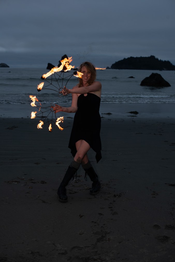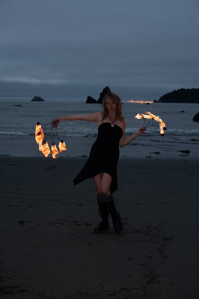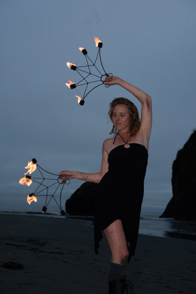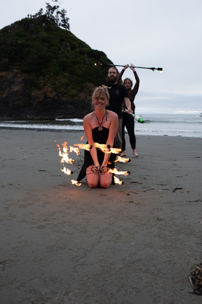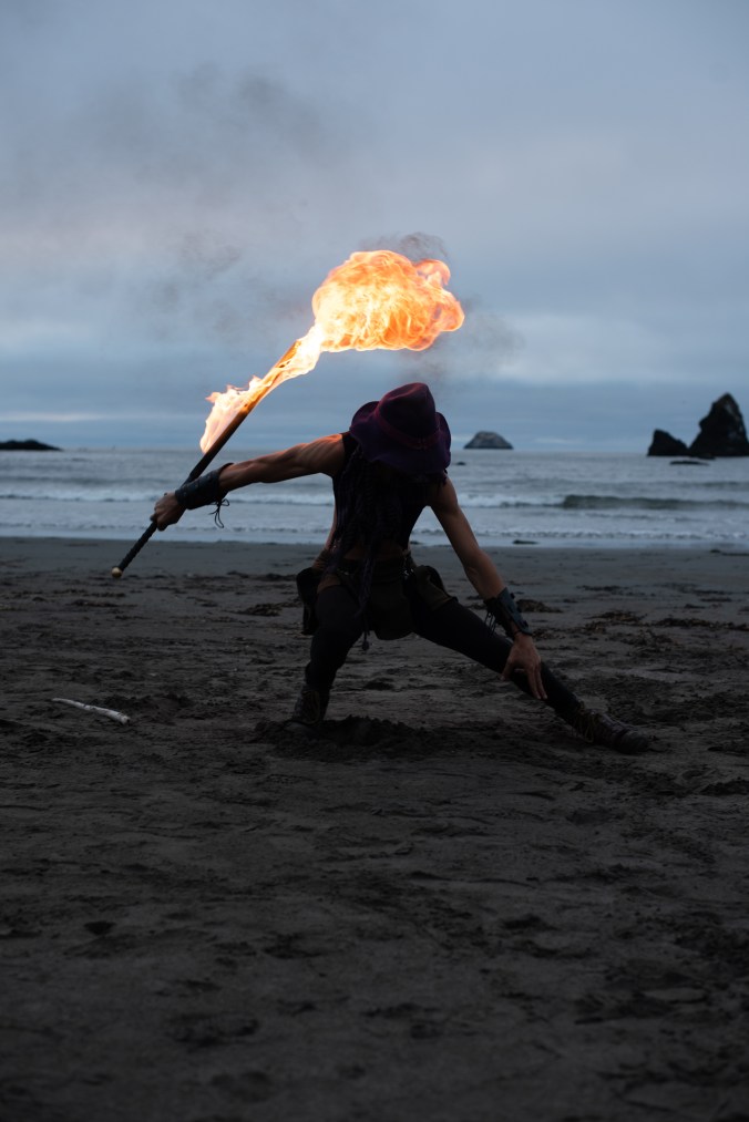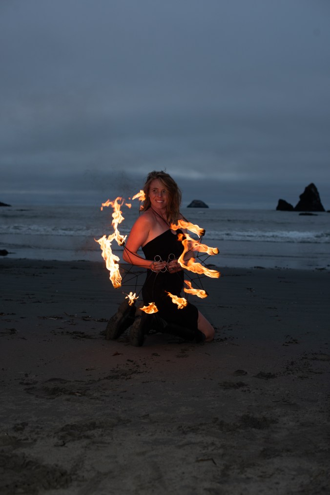 Oasis’s journey with fire began in the heart of the music community, where rhythm and movement called her toward something ancient and alive. She was first introduced to poi as a young woman, enchanted by the freedom and flicker of flame in motion. But it was at the Ojai Pirate Festival in 2008 that her true passion was sparked. There, beneath the night sky, she witnessed two women tossing fire fans into the air like spells in flight—a vision that lit a fire within her soul.