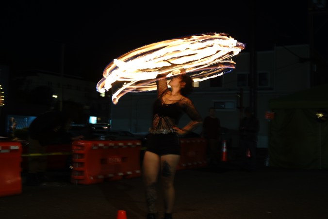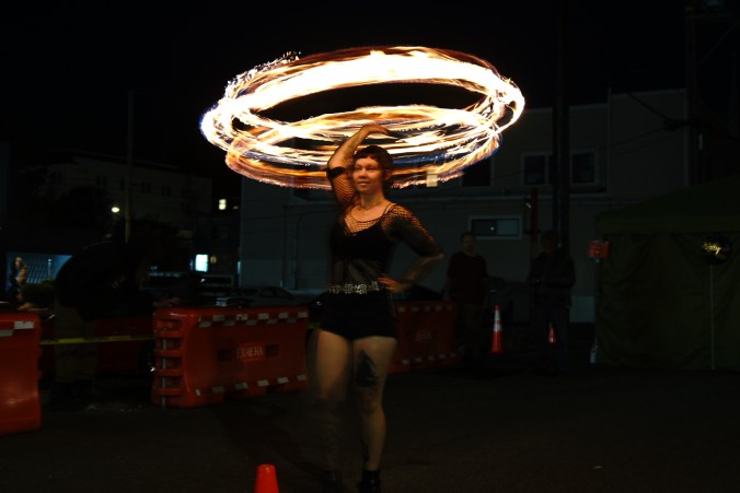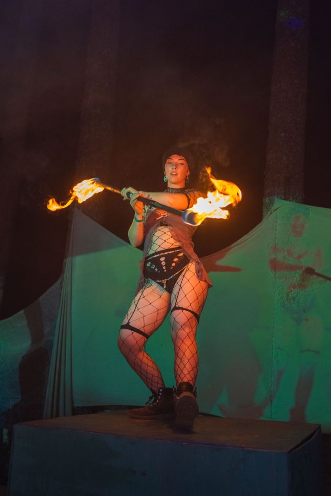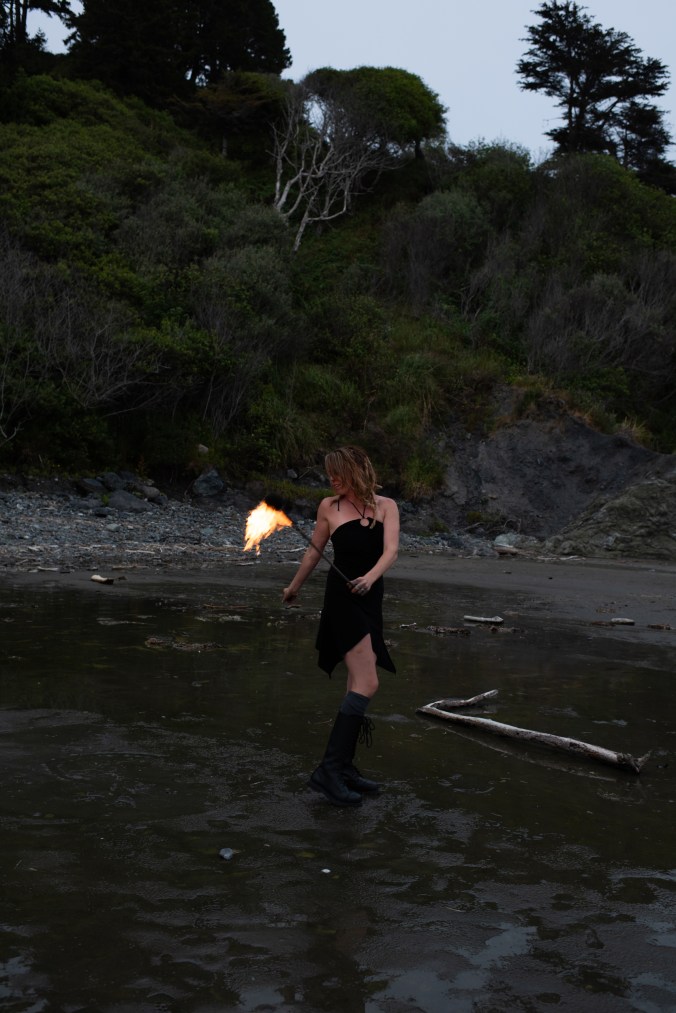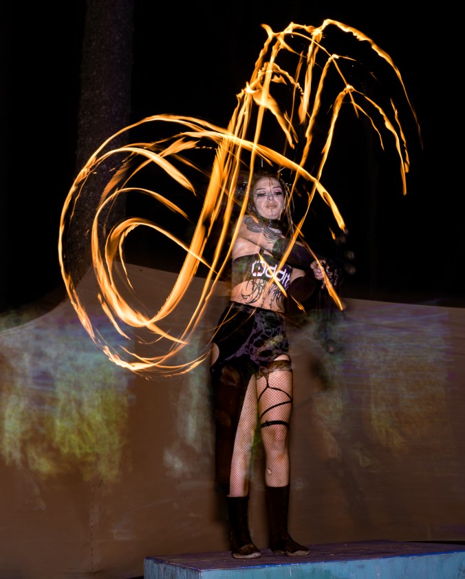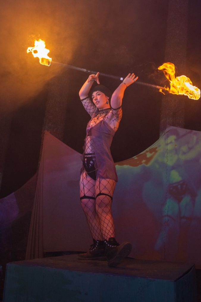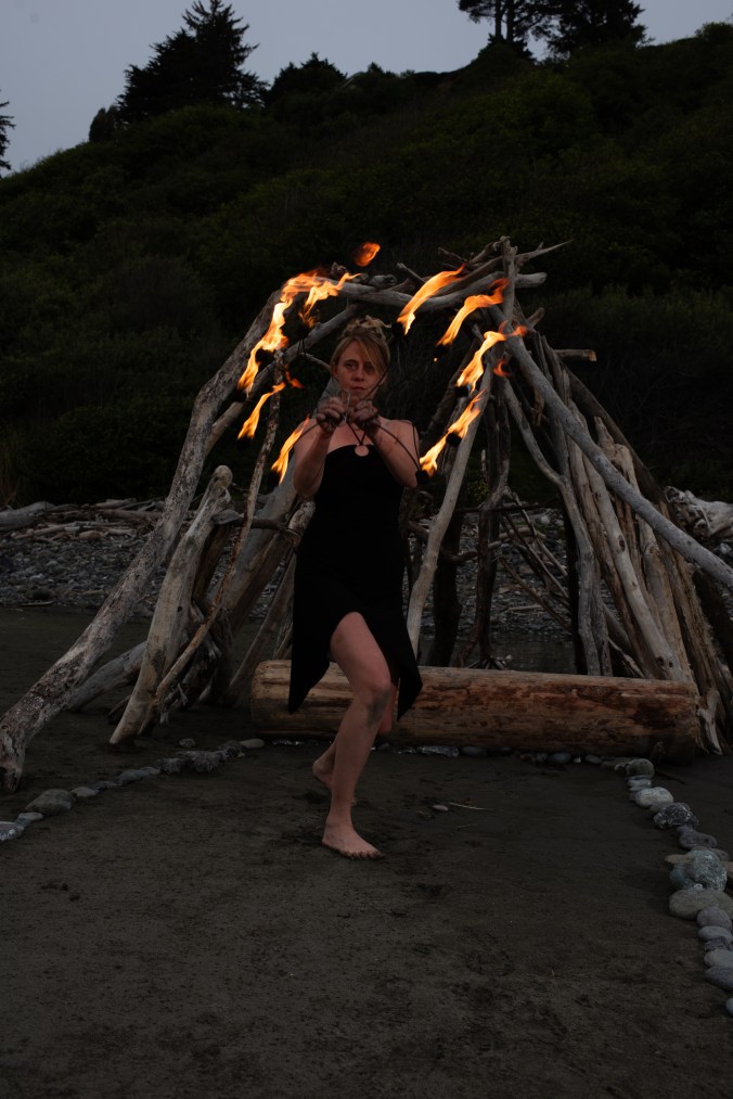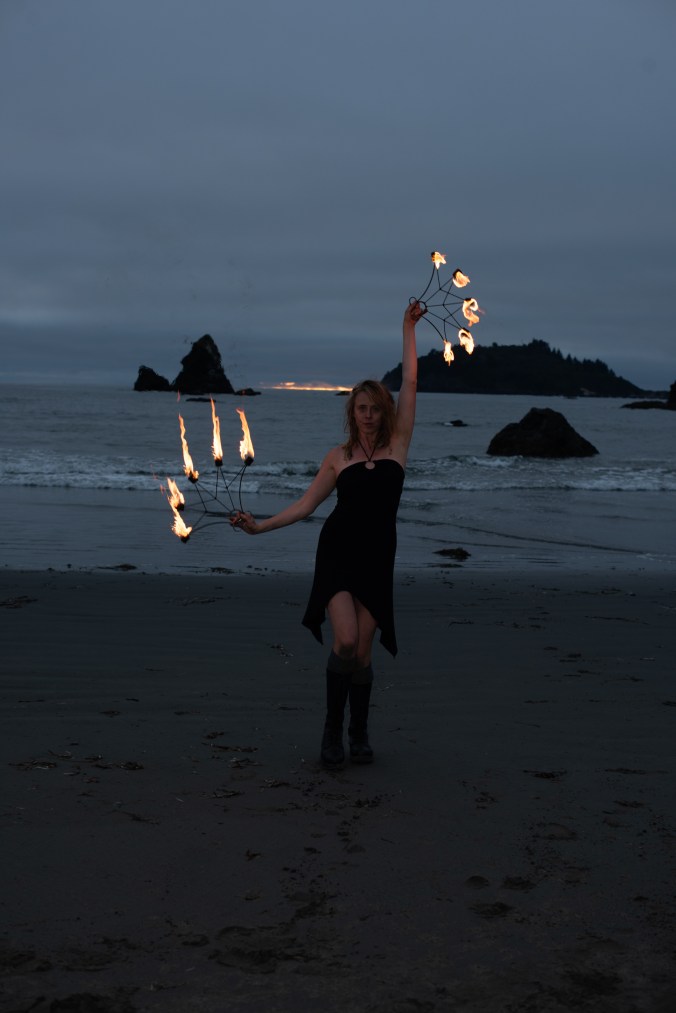 Oasis’s journey with fire began in the heart of the music community, where rhythm and movement called her toward something ancient and alive. She was first introduced to poi as a young woman, enchanted by the freedom and flicker of flame in motion. But it was at the Ojai Pirate Festival in 2008 that her true passion was sparked. There, beneath the night sky, she witnessed two women tossing fire fans into the air like spells in flight—a vision that lit a fire within her soul.