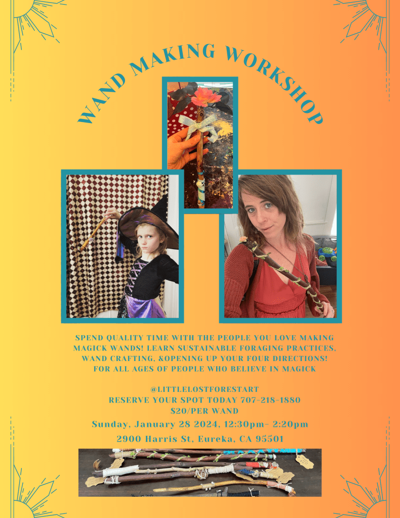 Join me, your host Natascha, as we embark on the foundational practices of wand crafting. You’ll select a stick sourced from the redwoods, home to some of the oldest trees on Earth. Most wands are made from driftwood, but some are sourced from the forest canopy. We will sand and stain the wood to your liking, and then you may choose a hemp wrap for the handle and attach a charm. You also have the option to include a stone thumb knob and a sparkle tip.